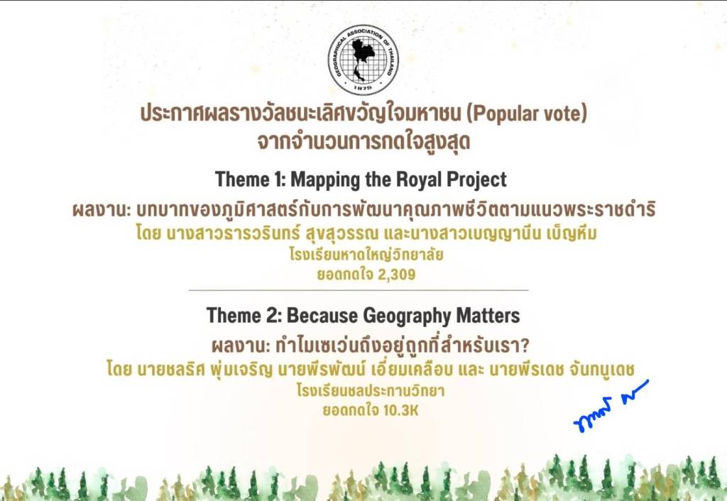 ผลงานเรื่อง “บทบาทของภูมิศาสตร์กับการพัฒนาคุณภาพชีวิตตามแนวพระราชดำริ” โดย นางสาวธารวรินทร์ สุขสุวรรณ และนางสาวเบญญานีน เบ็ญหีม โรงเรียนหาดใหญ่วิทยาลัย ยอดกดไจ 2,309 ครั้ง