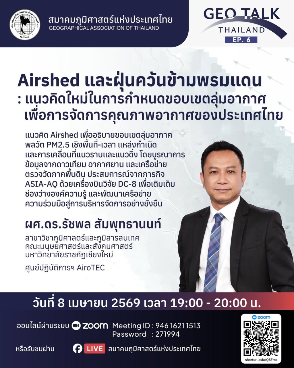เชิญชวนผู้สนใจเข้าร่วมฟัง GeoTalk Thailand EP.6 ในหัวข้อ “Airshed และฝุ่นควันข้ามพรมแดน : แนวคิดใหม่ในการกำหนดขอบเขตลุ่มอากาศเพื่อการจัดการคุณภาพอากาศของประเทศไทย”